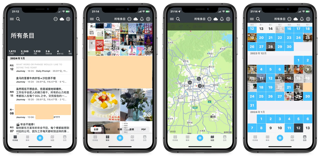 Day One 默认的是按时间线视图、查看的时候还有媒体视图、地图视图、日历视图。