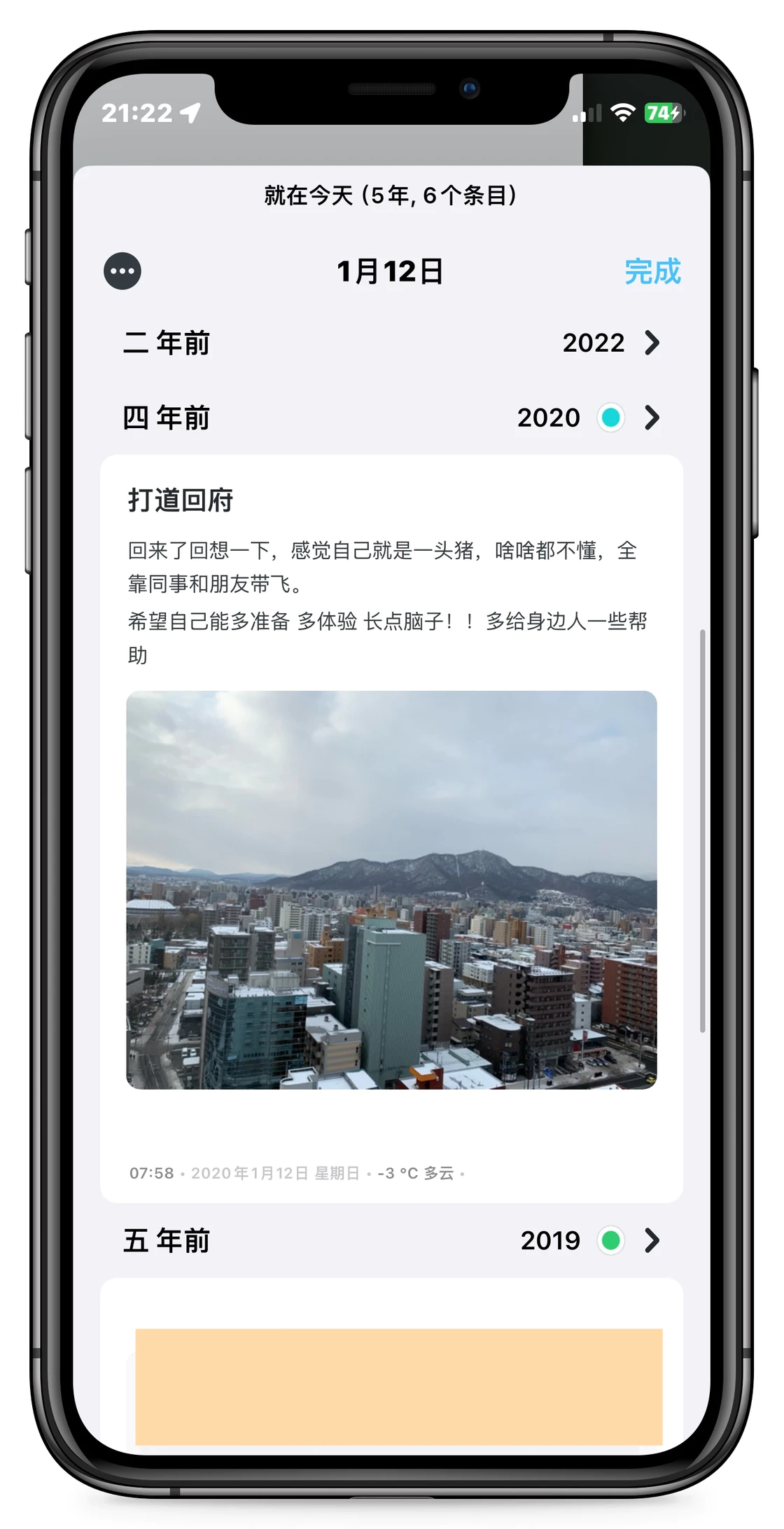 Day One 的那年今日功能也是一大亮点,每天闲来无事查看一下,感叹自己还曾经写过这样的思考,有这样的傻话。