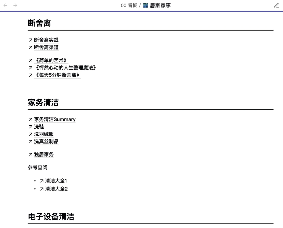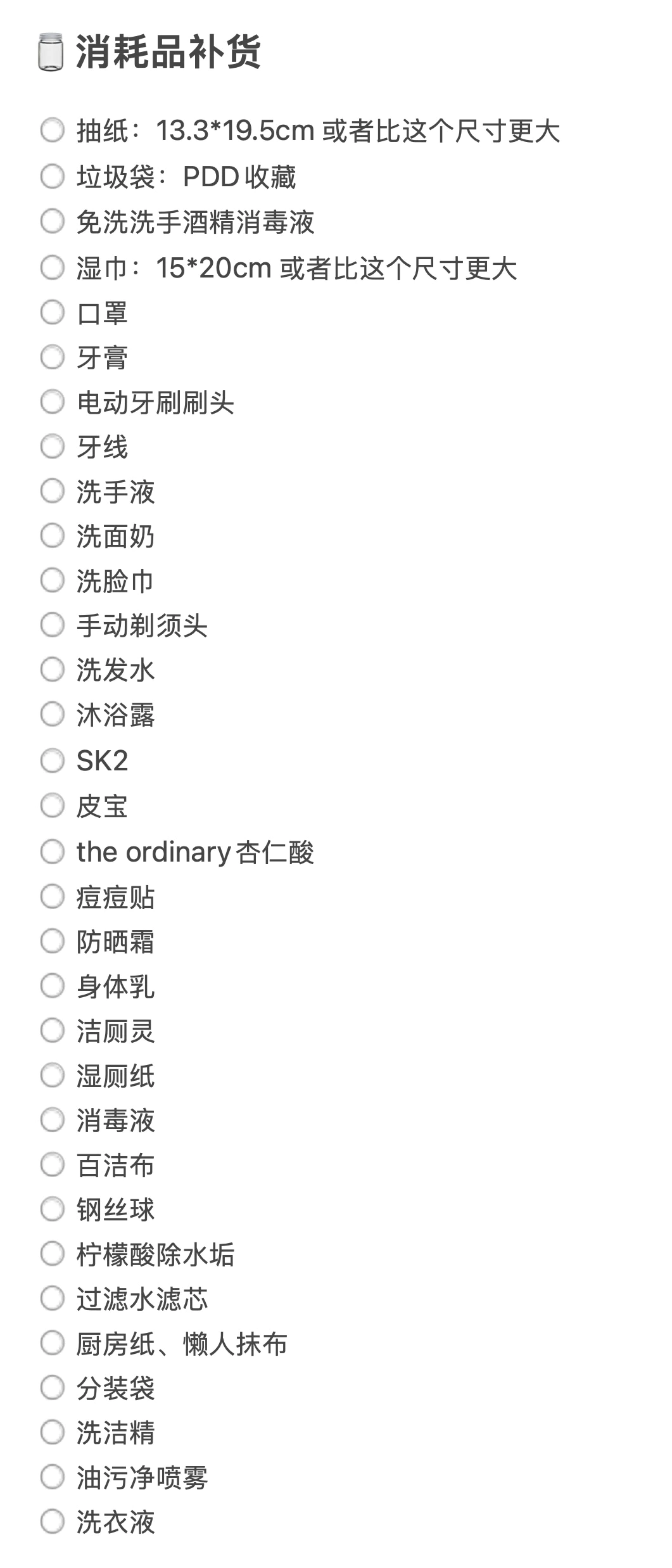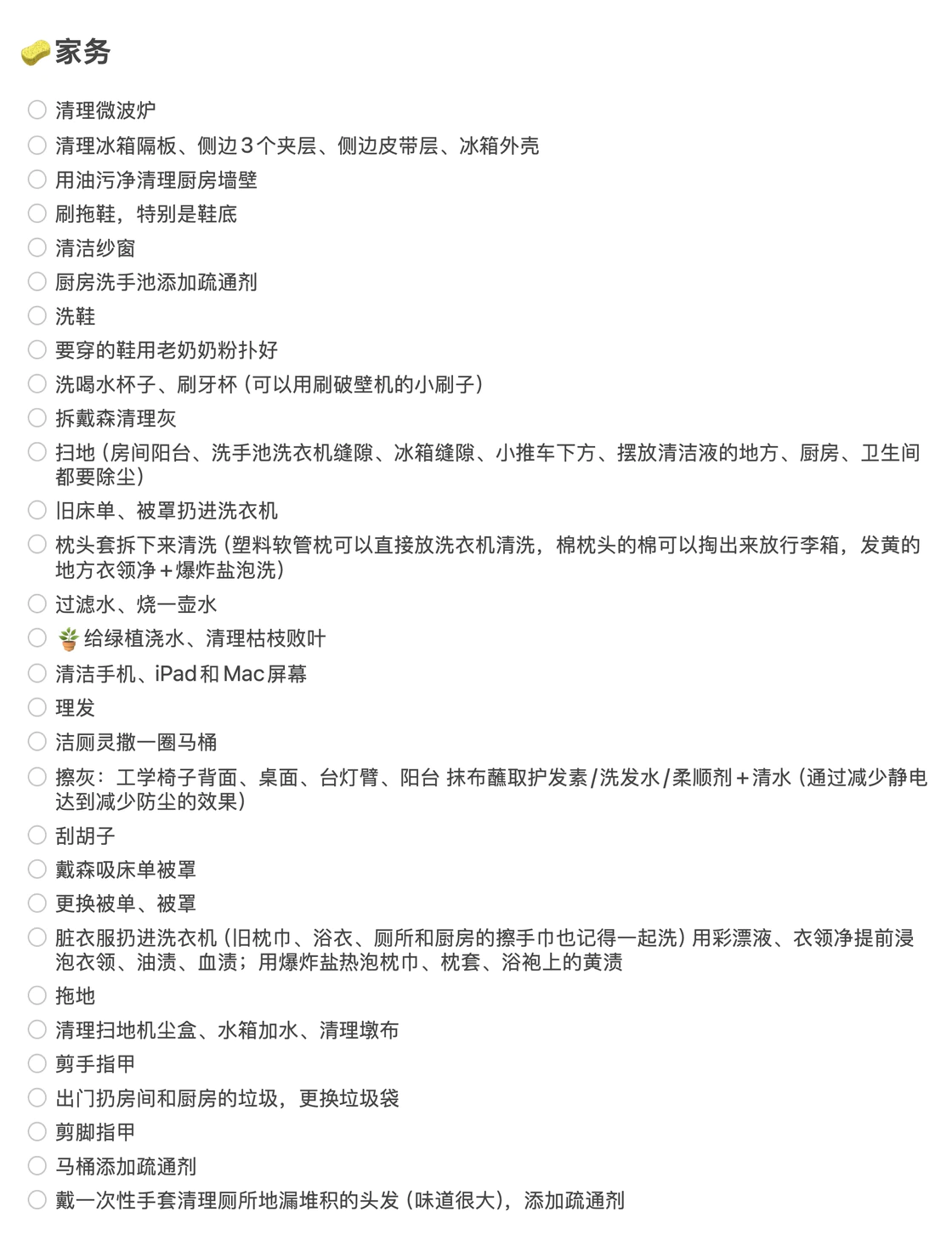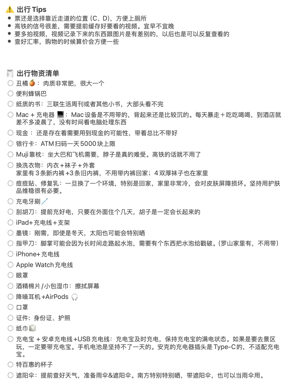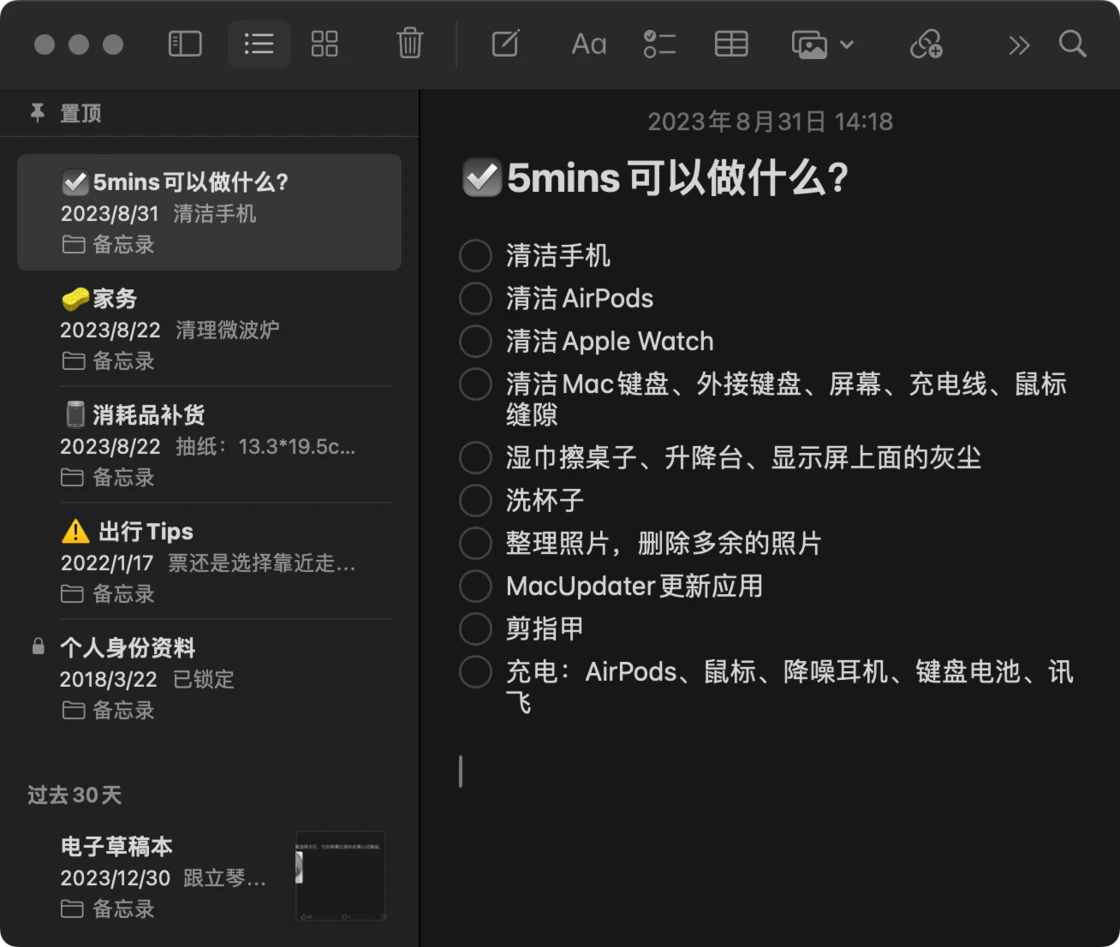 个人比较喜欢用 Apple 备忘录记录已经成熟的清单,例如之前发布过的 「5mins 可以做什么?」、「家务」、「消耗品补货」、「出行 Tips」。不用滴答清单记录这些清单的原因是,滴答清单的免费版对于每条清单的待办记录有上限。虽然可以通过在滴答清单建立笔记,再用笔记写 Markdown To-do list 的方式记录,但字体太小了,最终还是选用 Apple 备忘录。