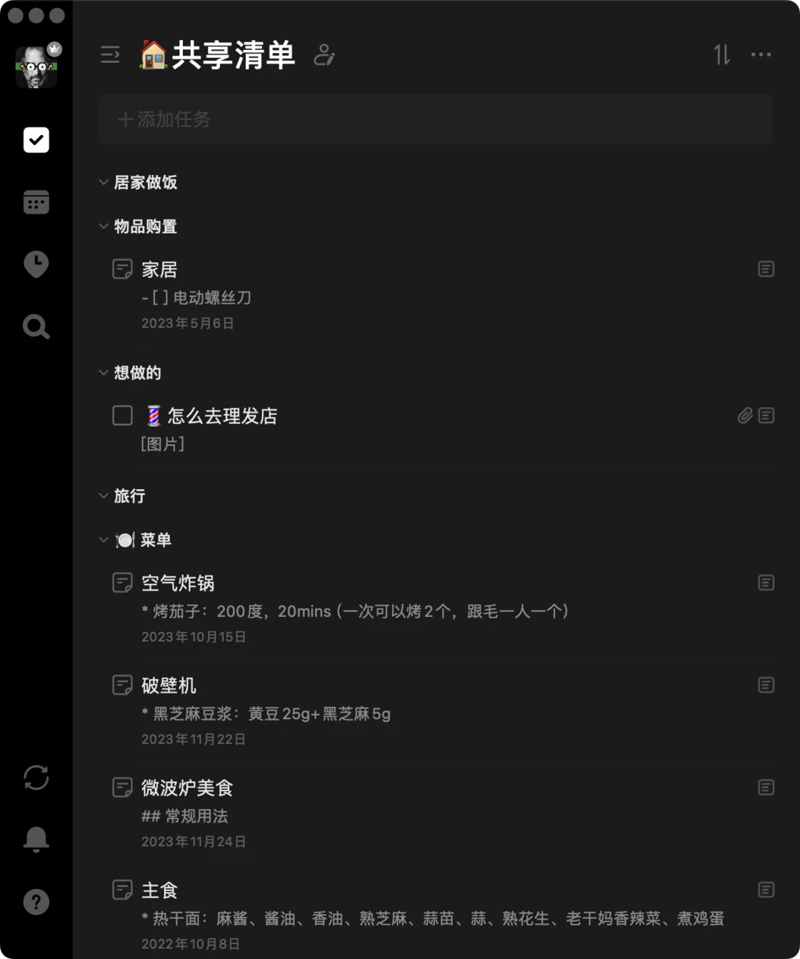 一般会跟爱人分享待办,例如旅行目的地中想看的地方、居家待办、想要购置的物品、2个人一起建立的菜单。是的,滴答清单是可以写协作笔记的,而且查看的效果真的很好。