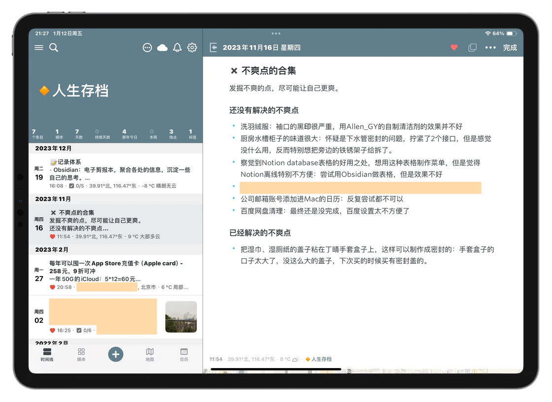 • 缺点:时间线翻阅 1000+ 条日记,无法准确定位,会出现卡顿情况,付费软件,每年付费 148 元