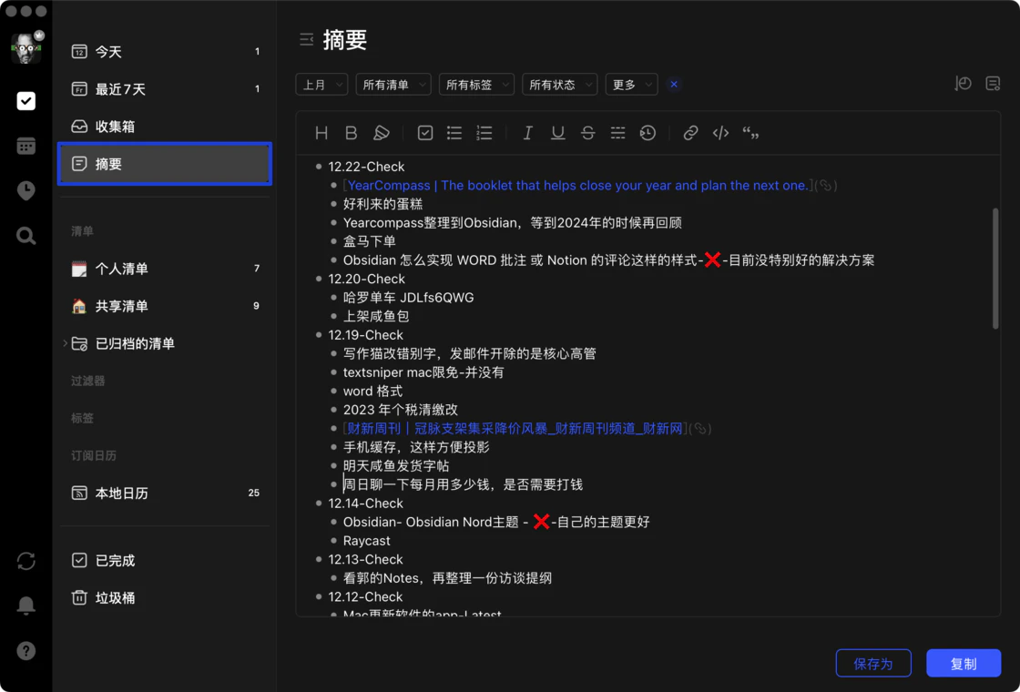 滴答清单的摘要功能做得特别好,特别方便回顾一个时期内做了什么。