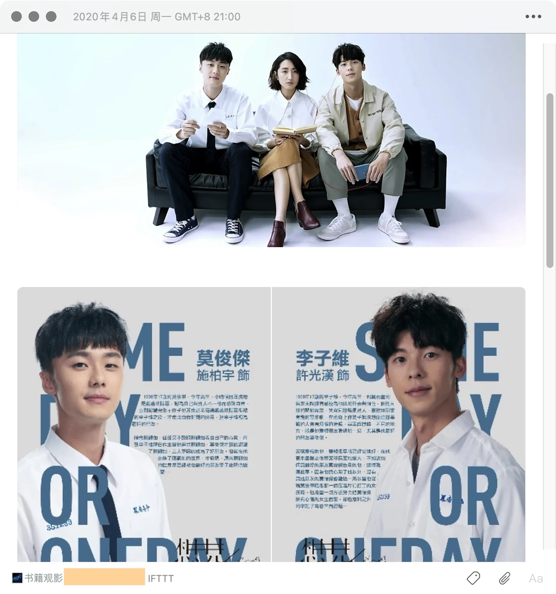 对于用 IFTTT 同步微博内容、豆瓣观影读书记录到 Day One,用 Day One 写图文笔记,我在之前撰写过一篇文章。感兴趣的朋友可以阅读这篇文章